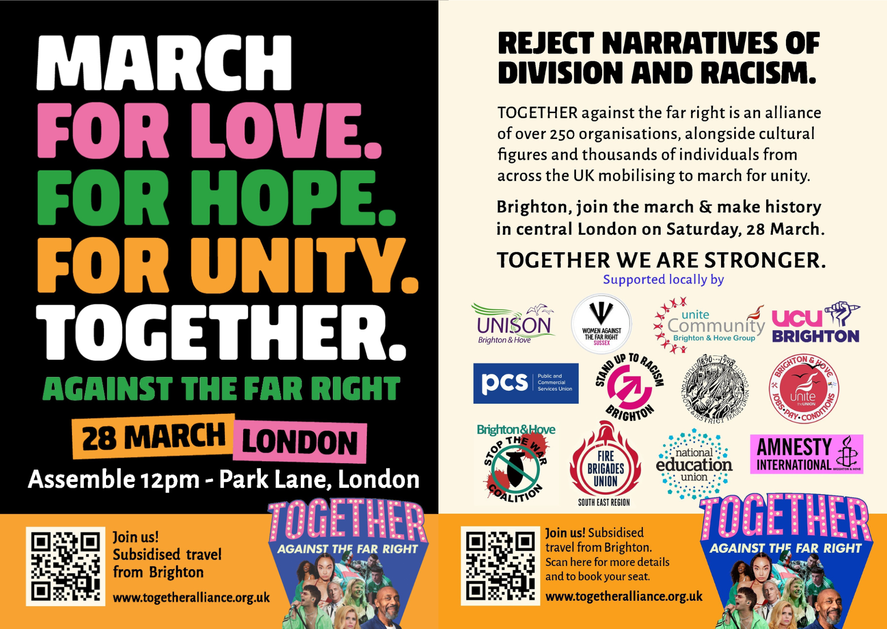 Brighton & Hove UNISON will join 250 other organisations supporting the TOGETHER march against the far right in London, at 12pm on the 28th March.